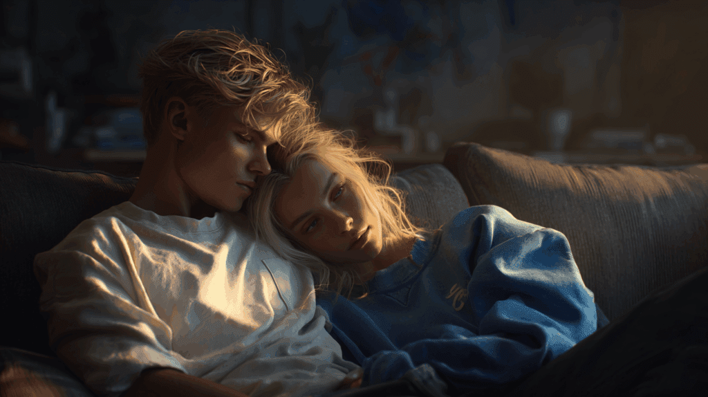 W końcu nie mogli już się od siebie oderwać. Patryk uniósł się nad nią opierając ręce o oparcie kanapy. Auri nie wiedziała jakim sposobem jej ręce zaczęły wędrować po jego klatce piersiowej i plecach, a ona sama położyła się na kanapie mając nad sobą całego Patryka.