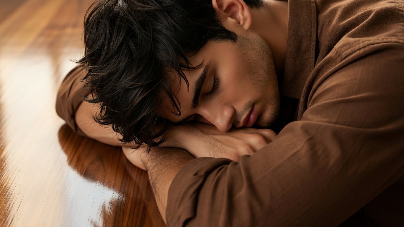 Chłopak usiadł na łóżku opierając głowę na rękach i chowając oczy.