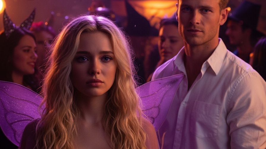 Miała na sobie krótką rozkloszowaną sukienkę wróżki mieniącą się kolorami tęczy, różowo-złote rajstopy i czarne baletki. Włosy upięła w kok z którego rozpuściła podkręcone fale włosów. A jej ramiona pokryte były przezroczystym tiulowym materiałem, na którym wszyte były miniaturowe akcenty halloween.
